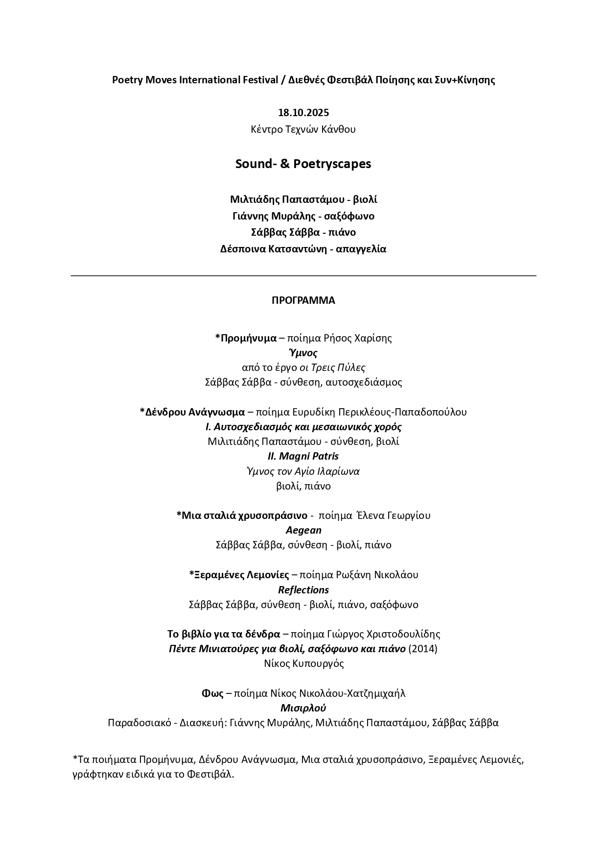 From Medieval Cyprus to contemporary sounds, music and improvisation intertwine with poetry, inspired by trees, roots, and the cycles of life. Miltiades Papastamou (violin), Yiannis Miralis (saxophone) and Savvas Savva (piano), create and guide us on a journey of sound, while Despina Katsantoni brings the poems to life on stage.